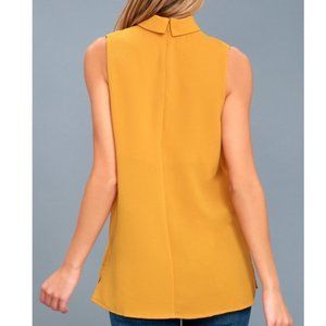 Lulu's Brand. Ciao Bella Mustard Yellow Cutout Mock Neck Top. A cutout mock neck creates a trendy look atop this lightweight, woven top with a darted, sleeveless bodice. Slight high-low hem with side slits.