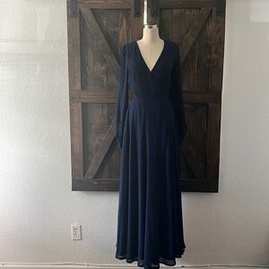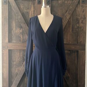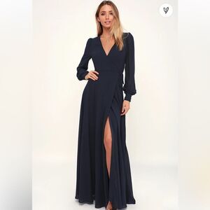 Only missing 2 buttons on sleeve rest good condition, Lulus Exclusive! It's easy to be swept away by the romance of the Lulus My Whole Heart Dark Navy Blue Long Sleeve Wrap Dress! This twirly dress kicks things off with a sultry wrap bodice and long sheer sleeves (with gathering at the shoulder and covered button deets along the cuffs), all shaped by gauzy woven fabric. A self tie cinches the fitted waist atop the full maxi skirt.