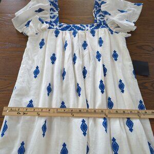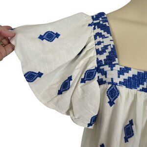 This bohemian-inspired dress features a square neckline, flutter sleeves, and intricate blue embroidery. Its lightweight fabric ensures comfort.