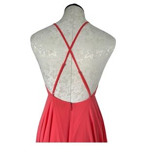 tags: bridesmaid, Maxi dress, wedding, spaghetti straps, special occasion, formal gown, prom, dance, homecoming, evening gown, Coral, pink, open back, georgette,