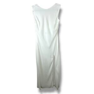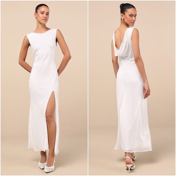 Lulus Yaneli White Boat Neck Cowl Back Sleeveless Fitted A-Line Maxi Dress. Sleeveless bodice, boat neckline, fitted a-line silhouette skims the curves, thigh-high slit. Lined.