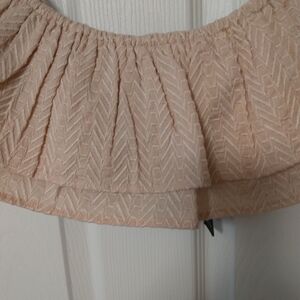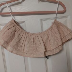 Stay stylish and chic in this NWT Abryelle crop top! Sleek and stylish, this strapless design features a blush pink shade adorned with an intricate embroidered pattern and tiered ruffles for a beachy look.