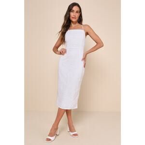 Lulus Celebratory Beauty White Mesh Embroidered Sequin Lace-Up Midi Dress. Sheer mesh atop a white knit liner, floral embroidery, sparkling clear sequins, long straps that lace up open-back design, straight neckline, fitted bodice with pleated details, fitted waist, figure-skimming. Hidden back zipper/clasp. Fabric has some stretch.