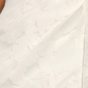 Channel your angelic side in the Lulus Dreamy Vision White Floral Burnout Jacquard Strapless Midi Dress! Lightweight woven fabric, with a burnout floral jacquard throughout, shapes a strapless, princess-seamed bodice (with hidden no-slip strips). Light gathering accents the fitted waist, atop a midi skirt formed by overlapping panels that shows just the right amount of skin. Hidden zipper/clasp at back. Perfect for bachelorette, bridal party, reception, rehearsal dinner, and so much more!