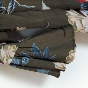 Green background with multi color floral pattern. 1/2 length sleeves with ruffled, bell cuff. Surplice neckline, true wrap style. Ruffled skirt. Unlined. New condition -- no flaws. Laid flat pit-to-pit: 17in. Laid flat waist: 15in. Shoulder to front hem: 44in. Back hem 6-8in lower than front hem.