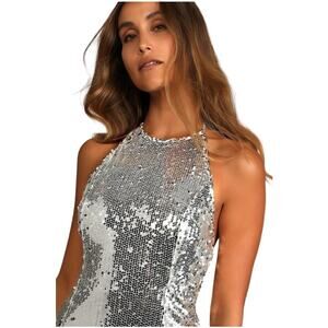 Lulus NWT Taking the Stage Silver Sequin Halter Maxi Dress