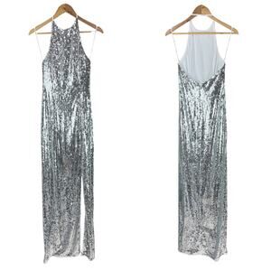 Lulus NWT Taking the Stage Silver Sequin Halter Maxi Dress Size XS Side Slit
