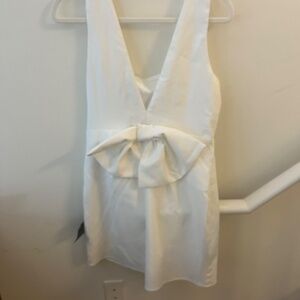 New with tags and never worn Lulus White mini dress with beautiful white bow in the back. A perfect dress for anything bridal or a fun night out!