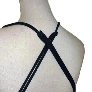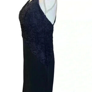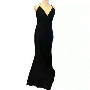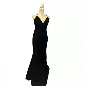 Worn once and in great condition. Floor Length, Low back with cross cross adjustable straps. Soft flowy fabric, super comfortable. From a smoke free home. Please feel free to ask question. The color was ver hard to capture with my lighting but it is a standard navy blue.