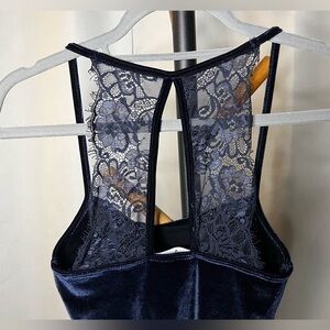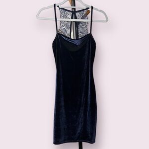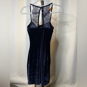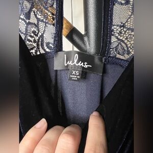 Lulus Navy Blue Velvet Mini Dress. Midnight navy blue velvet with spaghetti straps that meet in the back with lace panels. Stretchy fabric, like new condition. Size XS.