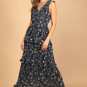 Elegant navy maxi dress with floral print. Features tiered ruffles and bow straps. Perfect for special occasions.