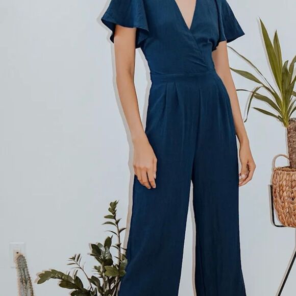 Lulu's Navy Flutter Sleeve Backless V-Neck Jumpsuit Size M