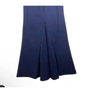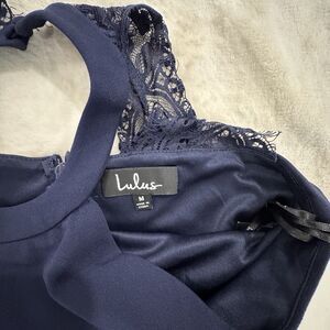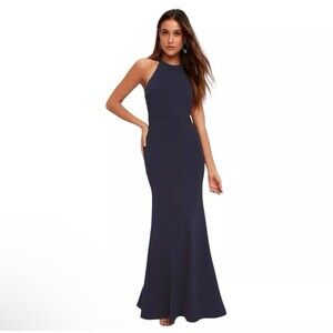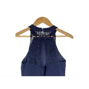 Elegant navy maxi dress. Features lace detailing. Sleeveless design. Perfect for formal occasions.