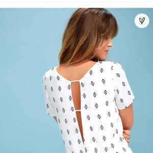 Lulus Navy and White Short Sleeve Shift Dress. Size XS. Fully Lined (except sleeves). Back has V-cutout with strappy details.