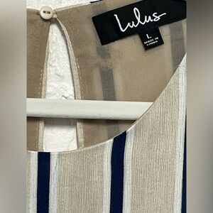 Stylish fully-lined mini dress with cream and navy stripes. Sleeveless and chic design. Ideal for casual outings. This super cute dress is in great ready to wear condition and comes from a smoke free home.