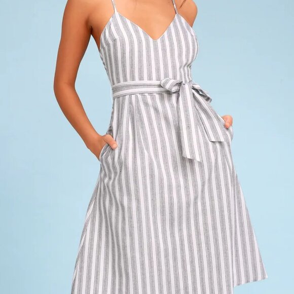 Crisscrossing adjustable spaghetti straps top a V-neckline and darted bodice made from black and white striped lightweight woven cotton. Fitted waist with tying sash and full midi skirt. Open back and hidden zipper/clasp.