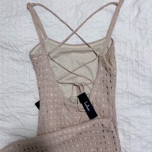 A romantic blend of effortless charm and feminine detail. This Lulus midi dress features an elegant open-back lace-up design, soft inner lining, and delicate crochet overlay in a neutral beige tone. Ideal for warm-weather getaways, date nights, or bridal events. Brand new with tags, size small.