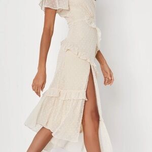 Chic cream maxi dress with ruffle details. Perfect for any occasion.