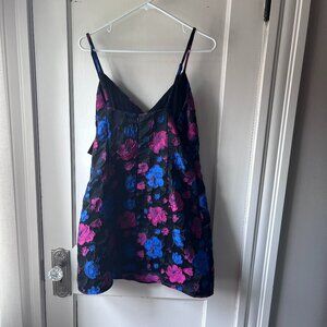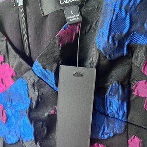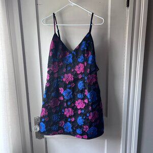NWT. This woven cocktail dress features a magenta and blue floral jacquard design as it shapes adjustable spaghetti straps and a V-neckline. A darted bodice tops an empire waist before continuing to an A-line silhouette with a flirty mini hem. Hidden back zipper/clasp.