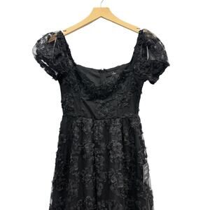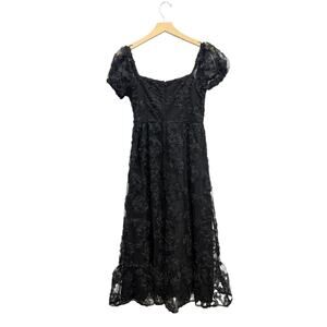 The Lulus Notable Elegance Midi Dress features a black mesh overlay with 3D floral appliques for a striking look. The dress is fitted with puff sleeves, sweetheart neckline, and an A-line skirt.