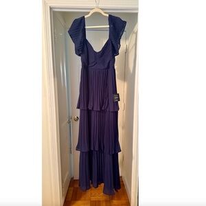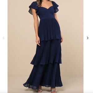 Elegant navy maxi dress. Features tiered skirt and flutter sleeves.