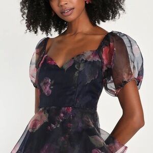 NEVER WORN - TAGS ATTACHED. The Lulus Oh-So Stunning Navy Blue Floral Organza Tiered Midi Dress is ready to bring extra extravagant vibes to any special occasion! Sheer woven organza boasts an elegant floral print throughout as it shapes a princess-seamed bodice, a flirty sweetheart neckline, and trendy puff sleeves (with elastic at the shoulders and cuffs). The fitted waist tops an A-line skirt that boasts chic flouncy tiers as it falls to a breezy midi hem. Hidden back zipper/clasp.