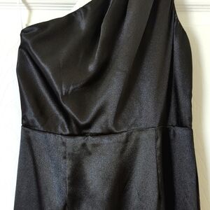 This beautiful black satin dress features a sleeveless silhouette, a wide one shoulder strap that leads to an open back accented by two wide straps, a lightly pleated bodice, and a lined high waist full maxi skirt. It has a zipper and hook & eye closure at the back. It is fitted through the bodice with the skirt being loose, relaxed and flowy. A super soft, silky, lightweight and breathable material creates a flattering silhouette that is sleek, glam, and regal. Perfect for a wedding or formal event! Very simple, classic, and elegant. High quality!