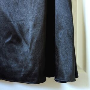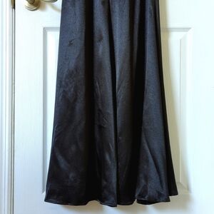 This beautiful black satin dress features a sleeveless silhouette, a wide one shoulder strap that leads to an open back accented by two wide straps, a lightly pleated bodice, and a lined high waist full maxi skirt. It has a zipper and hook & eye closure at the back. It is fitted through the bodice with the skirt being loose, relaxed and flowy. A super soft, silky, lightweight and breathable material creates a flattering silhouette that is sleek, glam, and regal. Perfect for a wedding or formal event! Very simple, classic, and elegant. High quality!