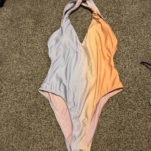 “Keeping it coastal” orange purple ombré swimsuit. Super cute and flattering one piece by Lulus. It’s in great shape but no longer fits me. Excellent used condition. No tag but a size large, has stretch and should fit a size 8-12