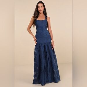 Lulus Opulent Aura Navy Floral Jacquard Tie-Back Drop Waist Maxi Dress S Wedding. New without tags. See all pictures for details. Currently SOLD OUT online.