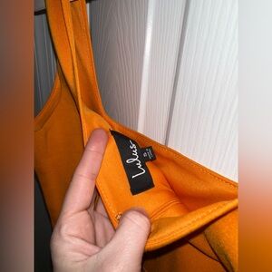 Lulu's fitted mini dress in a warm orange hue. Square neckline and wide straps. Crocheted waist detailing. Flared ruffle hem for movement. Sleek, simple silhouette.