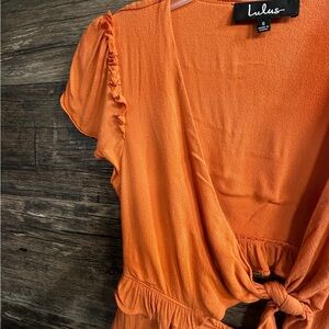 Step into a world of vibrant style with this orange mini dress from Lulu's, designed with a playful tie-front and flutter sleeves. The plunge neckline adds a touch of allure, making it an ideal choice for casual outings or resort wear. Its lightweight fabric ensures comfort and elegance in warm weather.