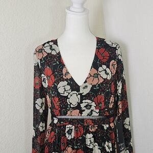 The Lulus Parade of Poppies Black and Red Floral Print Maxi Dress in size M is a whimsical and romantic choice perfect for various occasions like weddings, parties, or casual outings. This long sleeve dress features a V-neckline, zip closure, and balloon sleeves, adding a touch of elegance. Made from polyester, the dress is adorned with a floral pattern in red, giving off a Western, flower, wedding, rose, and whimsigoth theme. The dress is also lined and accented with lace, making it a stylish and versatile addition to any woman's wardrobe.