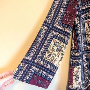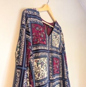 A very contemporary and eclectic design. The colors are rich and vibrant, most similar to the second photo. Long flowy sleeves and a ruffle at the base. Perfect condition, no flaws.