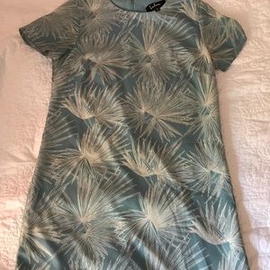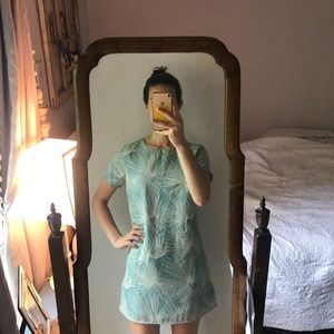 Shift dress with blue and white palm leaf pattern. Zipper back and built in slip.