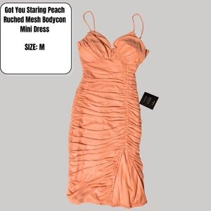 You'll attract all the best attention in the Lulus Got You Staring Peach Ruched Mesh Bodycon Mini Dress! Slinky and stretchy mesh constructs this figure-flaunting mini dress that begins with a gathered triangle bodice (complete with padded cups) and adjustable spaghetti straps. Fully ruched silhouette flatters every curve before falling to a mini hem with a side slit.