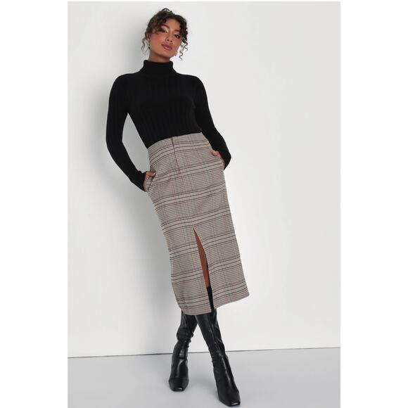 Lulu's Perfect Study Brown Plaid High-Rise Midi Skirt- Women's Size Medium