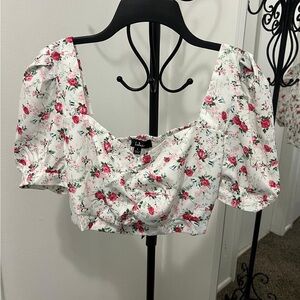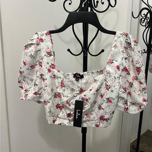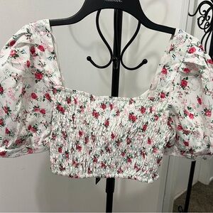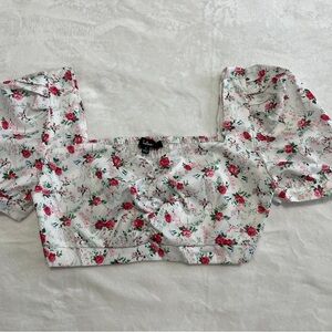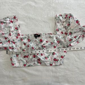 Embrace a romantic flair with this Lulu's crop top, featuring charming puff sleeves and a ruched neckline. The vibrant floral pattern in pink and red hues against a white backdrop adds a touch of elegance. Perfect for a chic, casual look, this blouse is a stylish addition to any wardrobe.