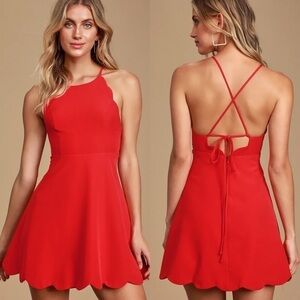 The little red dress is every stylish girl's must-have, and the Lulus Play On Curves Red Backless Dress is one you'll cherish forever! Skinny straps support a high rounded neckline as they crisscross and tie over an alluring open back with scalloped trim. The lightweight, woven bodice has princess seams that travel to a fitted waist, above the flaring skirt (with more scalloped detail!). Hidden back zipper with clasp.