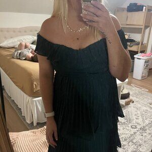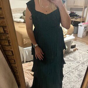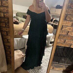 Worn once for my daughter's wedding. Size XL-I am a size 12/14 and it fit perfectly. Lulus. Material Is chiffon with pleats and ruffles. Can be worn off the shoulder or worn with the straps up higher. Emerald green (dark/forest green in color)