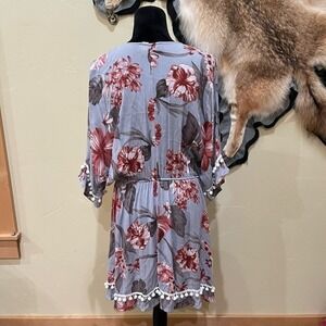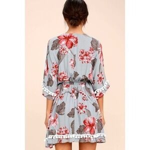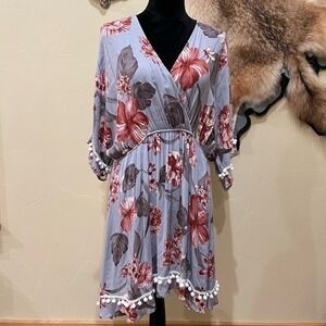 Lulus Exclusive! We foresee a fabulous future with you and our Pom Reader Blue Grey Floral Print Dress! White pompom fringe trims this woven dress with a blue grey, charcoal, and rusty rose floral print, surplice bodice (with modesty snap), and short sleeves. Elasticized waist tops the flaring skirt with more pompom fringe.