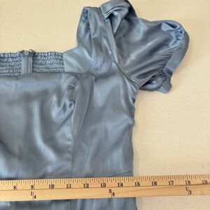 Features: Lulu's Effortless Romance Powder Blue Satin Maxi Dress. Smocked back. Puffed sleeves. Side slit