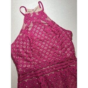 This beautiful Lulus skater dress is perfect for any occasion. The sleeveless pink lace design with layered accents and a zipper closure is both elegant and stylish. Its midi length and flower and princess theme make it ideal for spring and summer events.