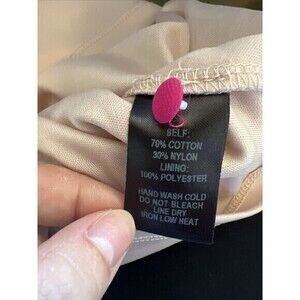 The dress is made of a combination of nylon and cotton fabrics and should be hand washed only. It comes in a women's size medium, and its regular size type and skater style are flattering for all body types. This dress is lined, has straps, and is not personalized. Made in China and not vintage or handmade.