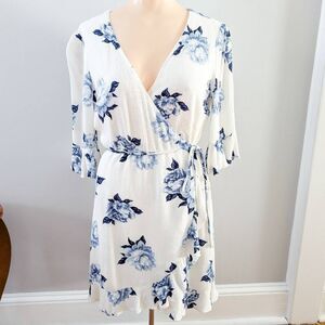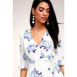 Lulus Pretty Peony Blue and White Floral Print Wrap Dress. Half filter sleeves and wrap neckline with snap for more coverage. 100% rayon