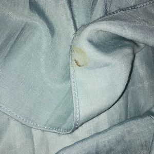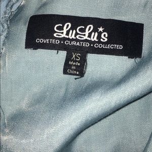 Lulus size extra small (which is a 0) prom dress. Worn once and has a small dirt stain on back inside seam, which could easily come out with dry cleaning or wash. Really pretty denim blue (lulu's color name) full length dress, it has a tie halter top & it cris cross laces up the front.
