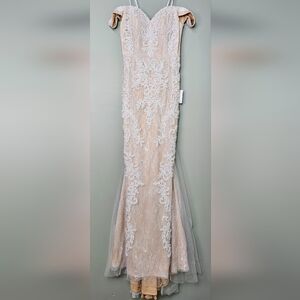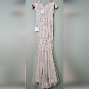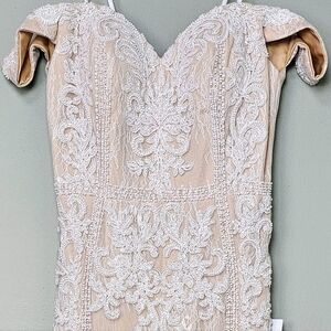Simply beautiful!! Beige stretch knit, white lace layer, beaded overlay.