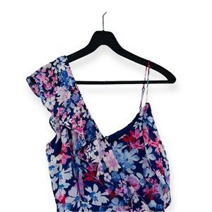 Asymmetrical maxi dress with a V-neckline and darted bodice. An empire waist and faux wrap bodice are supported by a thick tank strap and a cold shoulder, with an adjustable strap, that are both sweetly accented by ruffle details that carry into the pretty maxi skirt with a tiered ruffle hem. Hidden clasp/zipper at back.