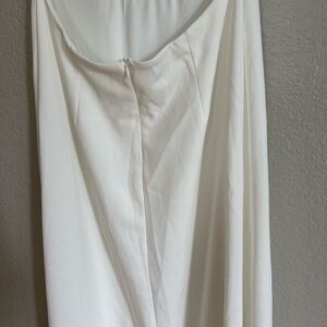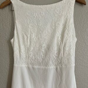 Lulus Radiant Forever White Lace Boat Neck Maxi Dress! Stretchy crepe knit fabric shapes this chic modern dress that has a high boat neckline and a lace overlay across the fitted bodice. Cutout at the back adds a hint of sultry, below a line of loop button closures. Elegant skirt falls from the high waist, finishing at a maxi hem with a lace gusset that cascades into a train at the back. Hidden zipper/clasp at back.