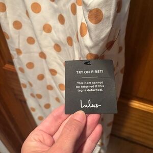Lulus Ready to Treat Tie Strap Bustier Midi Dress. White with tan polka dot. Sweetheart neckline. Midi length, overlapping skirt with ruching and side slit. Back smocking with zipper closure. Women's size medium. New with tags.